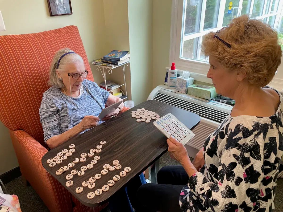 Rita Orr, 94, and her daughter Janice Rogers sit across a small table from each other to play Bingo. ( Ashley Milne-Tyte)